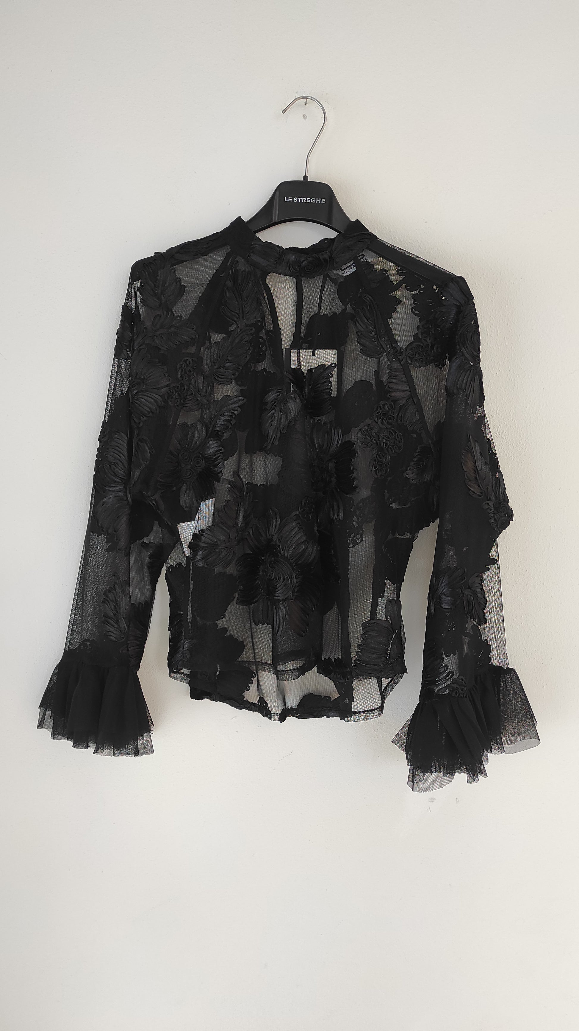 Blusa con collo a giro e maniche lunghe con polsino a volant