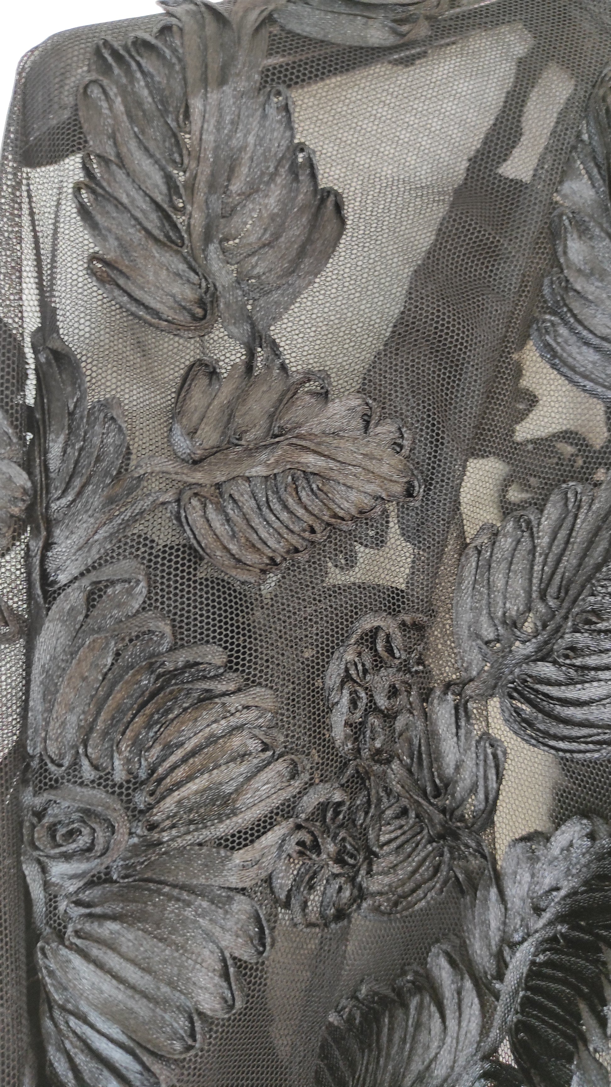 Dettaglio di tessuto semitrasparente con ricami tono su tono a fiore