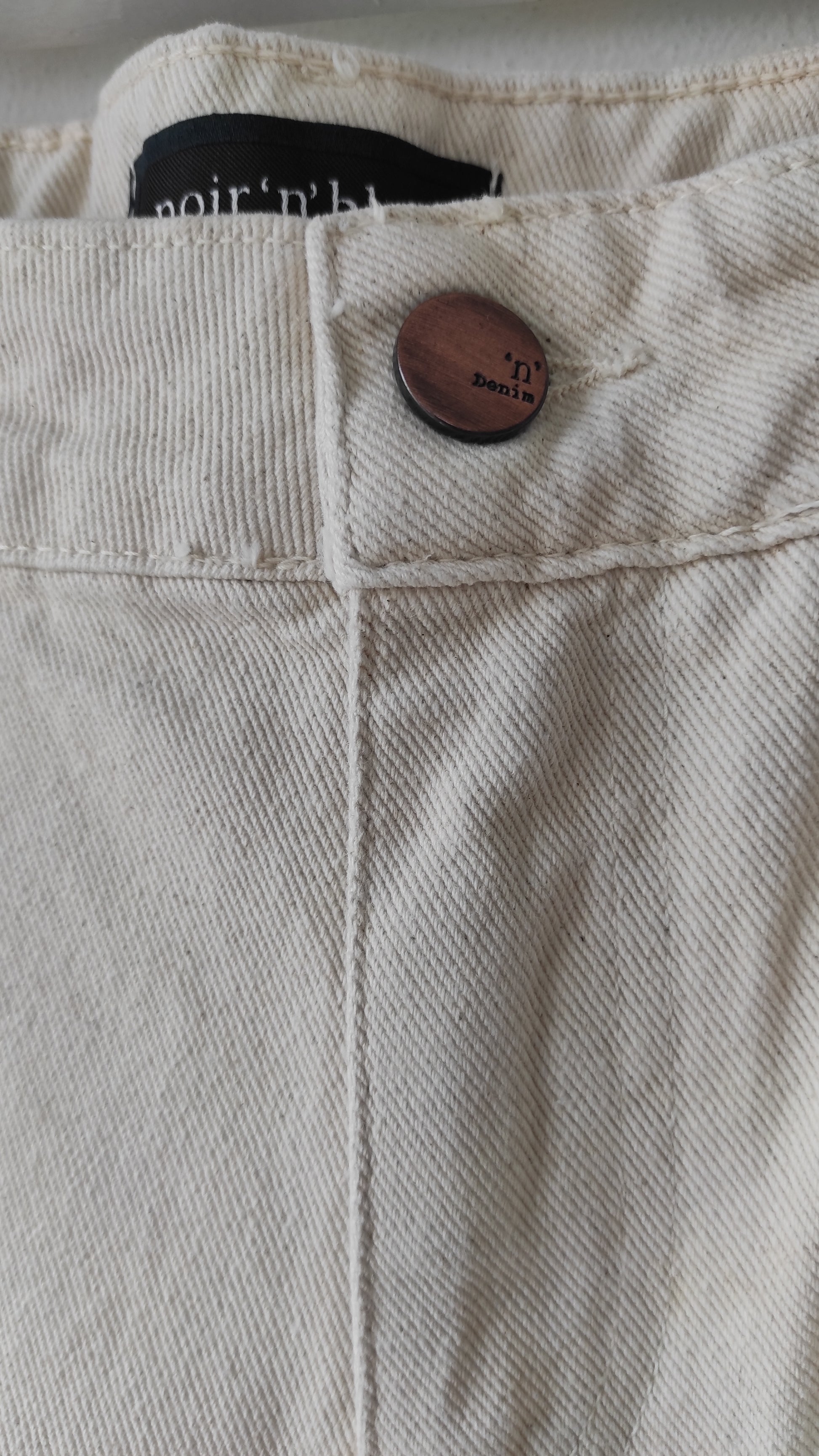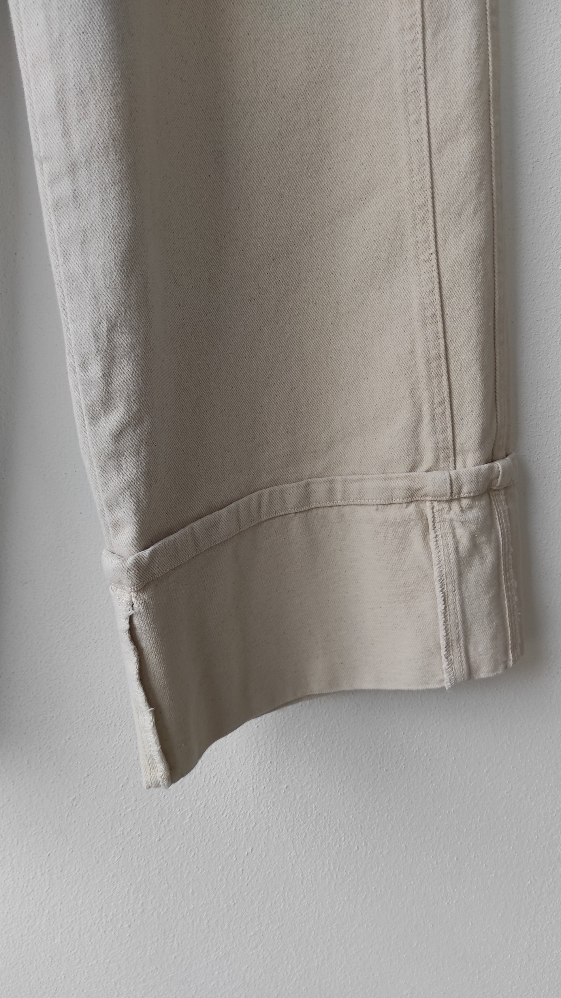 Jeans a vita alta con 5 tasche. Gamba extra larga con risvoltone e cucitura verticale.